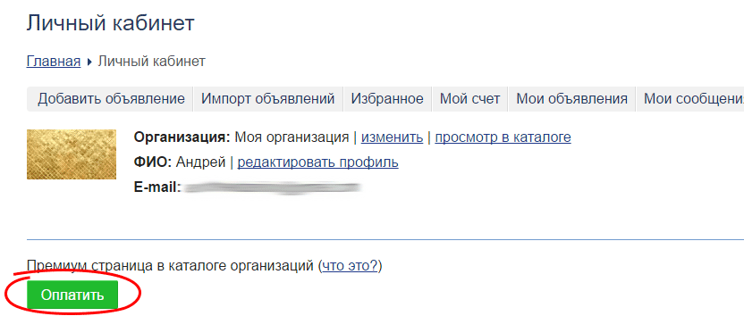 В разделе "Премиум страница в каталоге организаций" нажмите кнопку "Оплатить/Продлить"