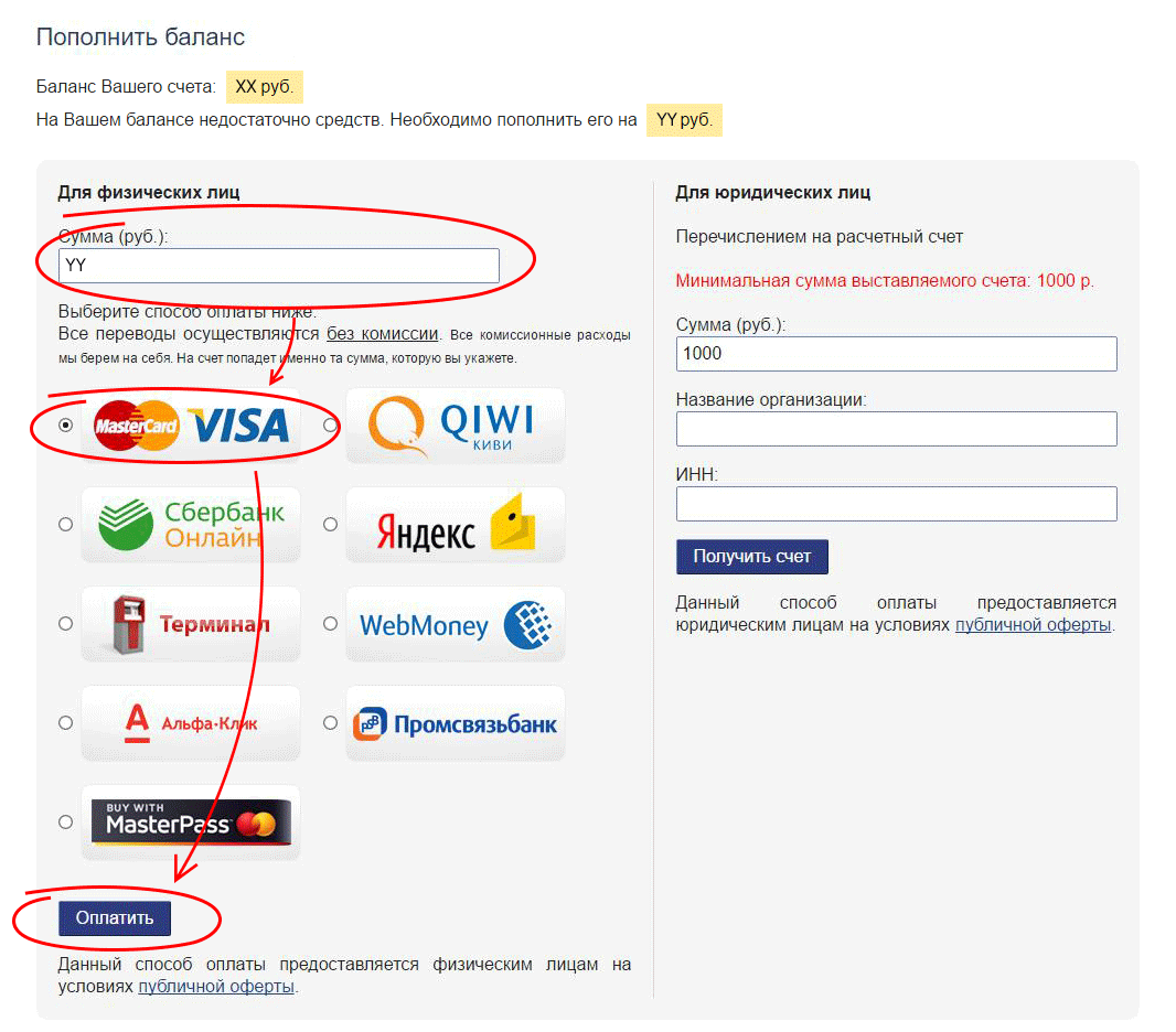 Если же средств недостаточно, система предложит пополнить баланс. Размер недостающей суммы автоматически будет внесен в поле "Сумма", но Вы можете изменить его по желанию. После выбора способа оплаты (например, картой VISA / MASTERCARD) нажмите на кнопку "Оплатить".