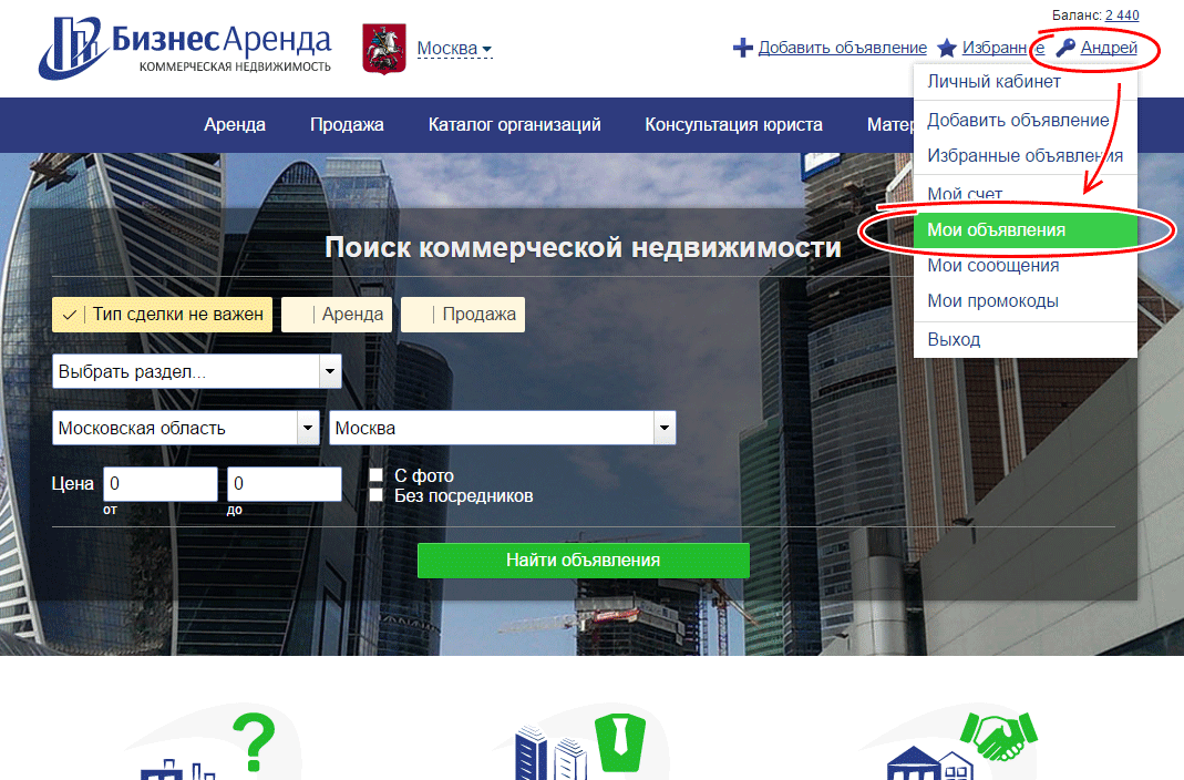 Зайдите в личный кабинет, либо на страницу "Мои объявления" с помощью меню в верхней части сайта.