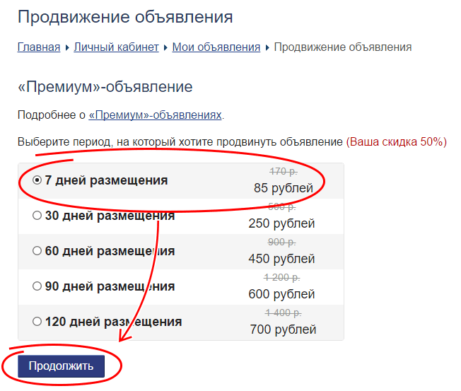 Выберите срок, на который хотите продвинуть объявление и нажмите кнопку "Продолжить".