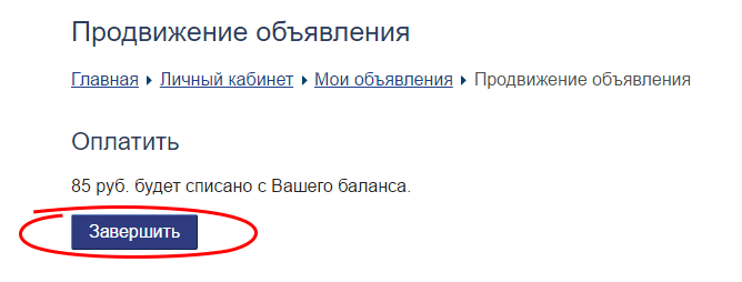 Если на Вашем балансе достаточно средств, система предложит ими воспользоваться. В таком случае, после нажатия на кнопку "Завершить", процесс продвижения будет окончен.